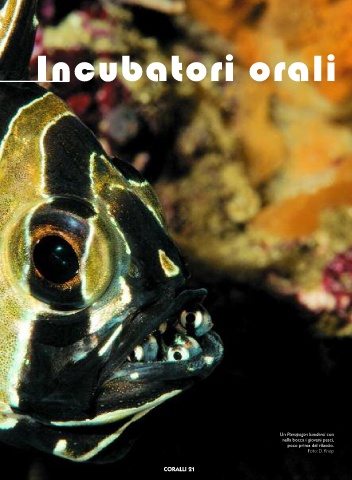 Incubatori orali Un Pterapogon kauderni con nella bocca i giovani pesci, poco prima del rilascio. Foto: D. Knop CORALLI 21