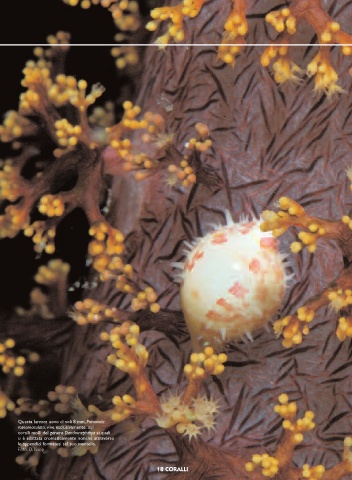 Questa lumaca uovo di soli 8 mm, Primovula roseomaculata, vive esclusivamente sui coralli molli del genere Dendronephthya ai quali si è adattata cromaticamente nonché attraverso le appendici formatesi sul suo mantello. Foto: D. Knop 18 CORALLI