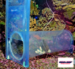 A questo punto ci si chiede come sia possibile rimuovere dei pesci da un acquario completamente allestito, con il minor impegno possibile, vale a dire senza lo svuotamento della vasca, ed ovviamente senza arrecare danno agli animali. La cattura con un retino in un acquario di barriera è illusoria; si romperebbe rapidamente, danneggerebbe i coralli e i pesci scomparirebbero tra la decorazione. Il modo migliore consiste pertanto nell’uso di una trappola per pesci con la quale, servendosi di una certa pazienza, si potrà rimuovere dall’acquario praticamente ogni pesce. Una trappola per pesci consiste sostanzialmente in un tubo di materiale acrilico trasparente più o meno lungo. La grandezza giusta è decisiva. Se è troppo piccolo molti pesci non vi entreranno mai. I pesci, infatti, hanno meno timore delle trappole più grandi. Una delle parti finali della trappola è chiusa da una lastra di plexiglas, l’altra è provvista di una chiusura a caduta. Nella parte chiusa del tubo è presente un piccolo foro in alto. Questo foro permette una più semplice manipolazione della trappola nell’acquario; l’aria, infatti, durante l’ingresso dell’acqua può in questo modo fuoriuscire, e anche durante la rimozione con il pesce catturato, l’acqua in eccesso riesce a drenare. È importante che per mezzo della chiusura a caduta si possano ottenere diverse estensioni di apertura. In questa maniera è possibile attuare una preselezione su quale pesce, piccolo o grande, si desidera togliere dall’acquario. A parte poche eccezioni, i pesci hanno bisogno di ore o giorni per abituarsi alla trappola. Fanno parte di queste eccezioni molti labridi curiosi. La maggioranza degli altri pesci, comunque, osserverà la trappola inizialmente con cautela e da una certa distanza. L’introduzione di cibo nella trappola (in particolare Mysis e del Krill fine) può contribuire a mitigare il timore. Inizialmente cauti ma poi sempre con maggiore interesse, attratti dal cibo, i pesci cercano di arrivare all’esca, fino a quando nuotano attraverso l’apertura. Una volta entrati divorano nervosamente qualche boccone ed escono subito dalla trappola. Per l’acquariofilo ci sono ora due possibilità: – Prima possibilità: si cerca di catturare il pesce desiderato appena entra per la prima volta nella trappola. Questa non appare però la possibilità migliore, perché in questa fase la maggior parte dei pesci sono ancora piuttosto cauti e nervosi; se non riuscite a catturalo al primo tentativo, avrete bisogno di molto tempo prima che provi a rientrarvi. – Seconda possibilità: lasciate in acquario la trappola per due o tre giorni, senza tentativi di cattura, somministrando il mangime esclusivamente al suo interno. Con questo procedimento il rischio di rendere inutile la trappola a causa di un errato utilizzo è sensibilmente minore. Ancora un consiglio: il mangime dovrebbe essere posto nella parte finale posteriore della trappola. Il cibo che si trova vicino alla porta a caduta, a causa dei movimenti nervosi dei pesci, fuoriesce con facilità dalla trappola finendo nell’acquario. Dato che i pesci si ciberanno dapprima di questo mangime, il tempo necessario per la cattura aumenterà cospicuamente. Di regola la fame e la bramosia di cibo sono così grandi che i pesci prima o dopo perderanno il loro timore per la trappola. In alcuni casi problematici, però, all’inizio è necessario utilizzare dei trucchi per avere successo. Un esempio in tal senso può essere la femmina dei pesci angelo pigmei già citata. Non voleva assolutamente entrare nella trappola, nessuno dei mangimi solitamente utilizzati riusciva ad attirarla all’interno. C’erano però anche i polipi del corallo duro Pocillopora che apprezzava tanto. Fu necessari spezzare pertanto un grande ramo da una Pocillopora e porlo nell’angolo più lontano della trappola. Ai polipi che ora si potevano aprire indisturbati, mentre i coralli nell’acquario erano costantemente chiusi per via del continuo disturbo, la femmina non è riuscita a resistere a lungo. Nel caso di alcuni pesci l’acquariofilo dovrà armarsi di molta pazienza per catturarli. In tal senso possiamo citare il caso di un maschio di un branco di Chromis viridis, che aveva scelto come luogo di riproduzione una grande colonia di Pocillopora damicornis. A tale scopo aveva accuratamente pulito dei rami rimovendo il tessuto corallino e liberandoli dai polipi. Non era però questo il problema, perché la distruzione della colonia era localmente limitata ad alcuni rami. Molto più grave era il comportamento del maschio quando poco dopo iniziò a mordicchiare il mantello di una Tridacna che di conseguenza rimaneva sempre più chiusa. Per salvare la conchiglia fu indispensabile rimuovere il pesce dall’acquario. Più facile a dirsi che a farsi, perché invece di entrare nella trappola, attendeva pazientemente davanti all’ingresso fino a quando un altro pesce ne usciva con un boccone di cibo per poi rubarglielo. Solo diversi giorni dopo questo pesce entrò nella trappola.