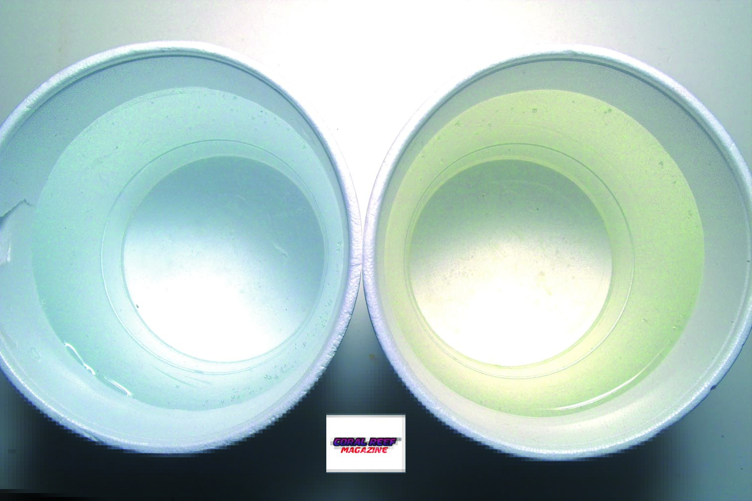 Un confronto fra l’acqua marina fresca di preparazione e quella prelevata da un acquario di barriera avviato. Si vede chiaramente la differenza di colore: quella fresca non ha alcun colore.